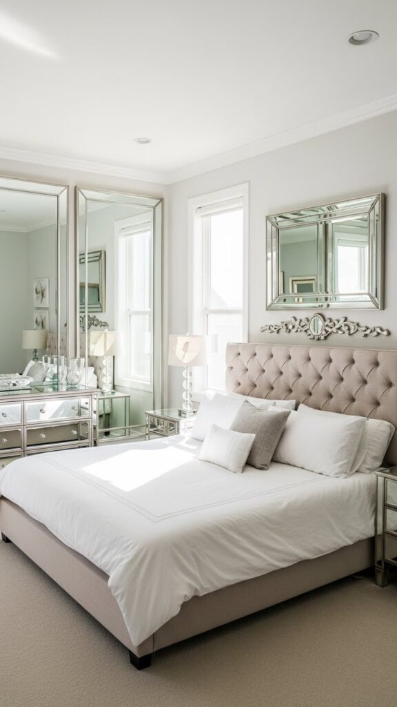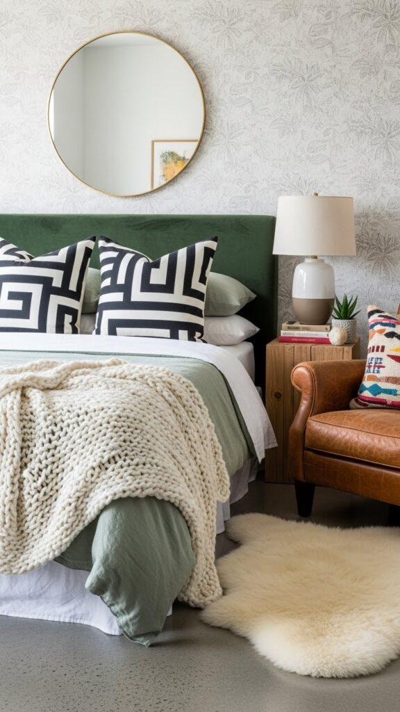 Mirrors can lighten up all the dark tones in the room while making it feel bigger and more open. A large round mirror with a black frame brings contemporary style without adding too much weight to the wall. You can use mirrors above the dresser, behind the nightstand lamps, or even leaning against the wall for a casual aesthetic. Mirrors also reflect textures, lights, and patterns beautifully, which helps highlight the beige elements and keep everything feeling harmonized. They act almost like decorative windows that brighten the contrast and soften the boldness of black.