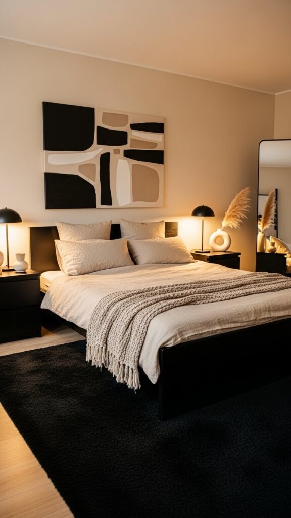 The black-and-beige aesthetic naturally leans toward minimalism, so it helps to choose furniture that feels sleek and understated. Think clean lines, simple silhouettes, and pieces that serve multiple purposes without feeling bulky. A black metal bed frame or beige upholstered headboard keeps the room stylish without overwhelming the space. Keeping the furniture uncomplicated lets the color scheme do its job, creating a bedroom that feels calm, intentional, and easy to keep beautiful. Minimal furniture also gives space for smaller accents to shine, like lamps, mirrors, or plants.