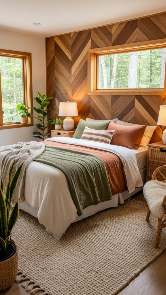 Wood tones pair beautifully with black and beige, adding a natural warmth that makes the whole palette come alive. Whether it’s a wooden bed frame, floating shelves, or small décor elements, wood adds that comforting farmhouse-meets-modern feel without clashing. Light wood tones feel airy and minimal, while darker stains look rich and elegant—either way, they help soften the bold black accents so the room feels grounded. Adding wooden pieces also brings in a subtle rustic charm that works perfectly if you love a modern organic or cozy neutral aesthetic.
