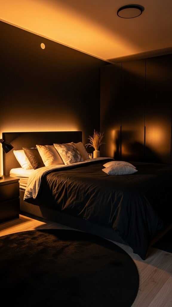 Lighting is everything in a black and beige bedroom because it controls how dramatic or cozy the room feels. Warm-toned lights make beige glow beautifully while softening the boldness of black décor pieces. Instead of harsh ceiling lights, opt for bedside lamps, wall sconces, or warm LED strips behind the headboard to create ambient lighting. Soft lighting also enhances textures like linen, velvet, and woven materials, making the whole room feel more welcoming. When your lighting is warm and layered, the dramatic contrast becomes cozy instead of intense.