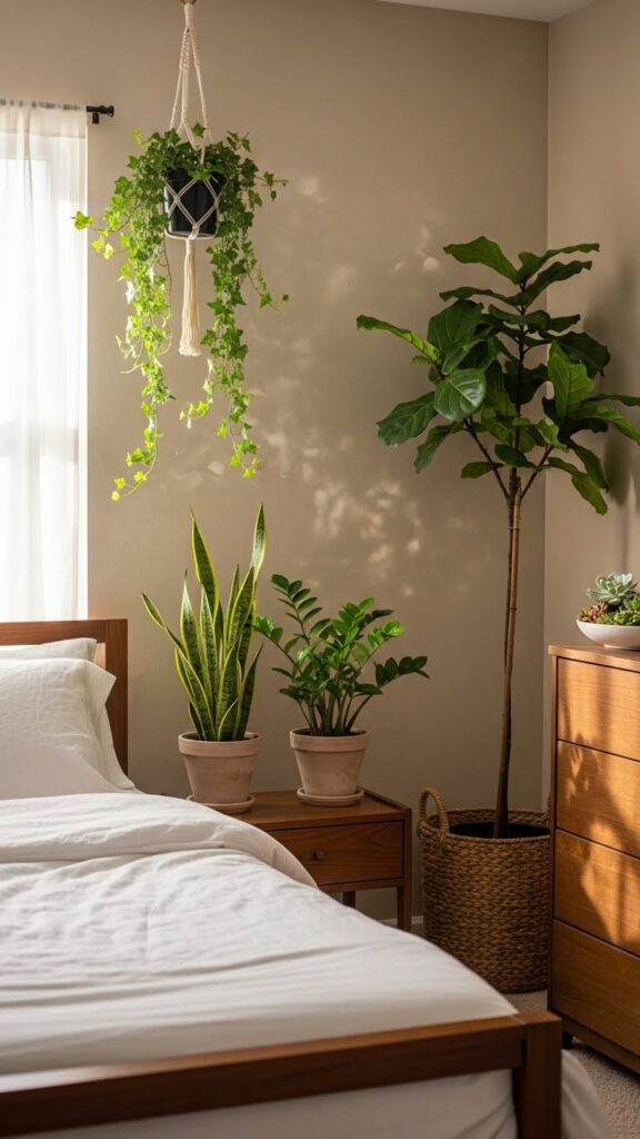 Greenery looks stunning in a black and beige aesthetic because it breaks up the neutral tones with a natural pop of color. Plants like snake plants, olive trees, or pothos bring soft movement and freshness to the space while keeping the décor looking modern and clean. Even small plants on the nightstand or windowsill can bring life to the palette, making the room feel lighter and more serene. If you prefer low-maintenance options, dried leaves or pampas grass also complement beige beautifully while adding texture. Plants create a calming energy that balances the sleekness of black décor effortlessly.
