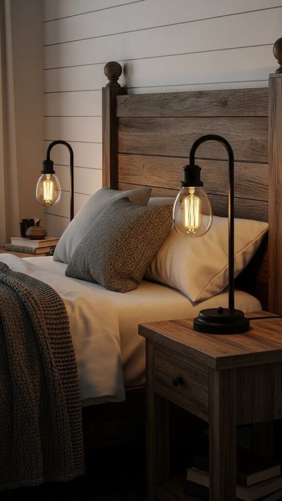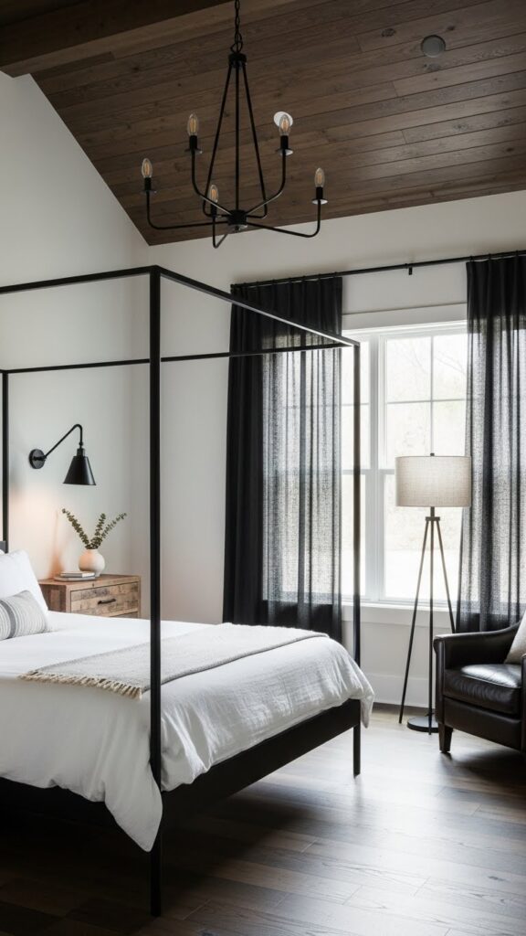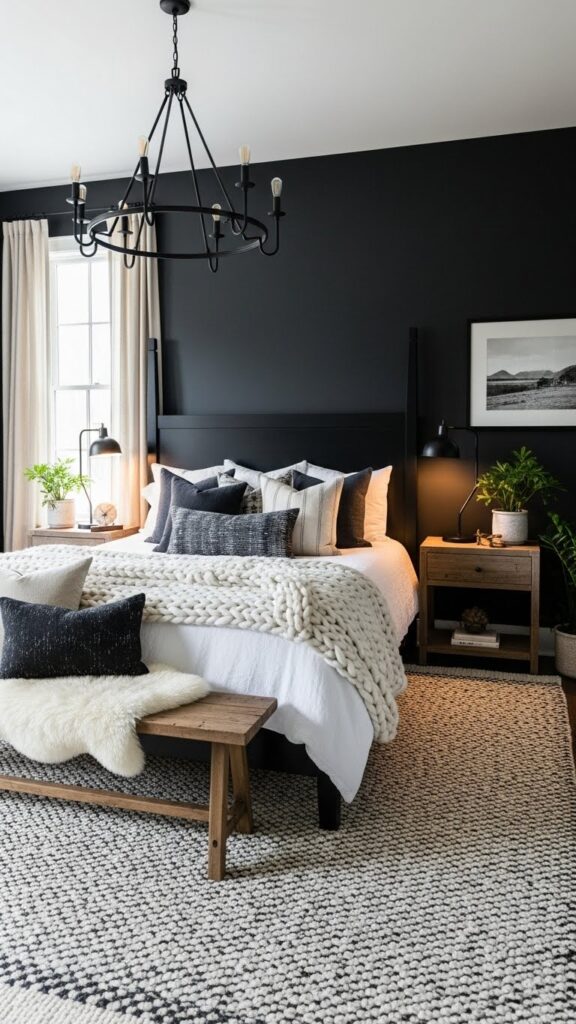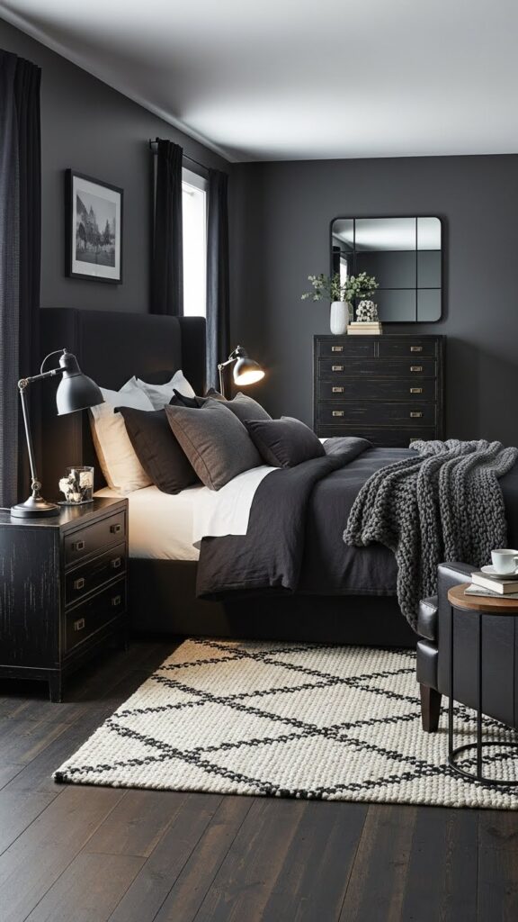 Table lamps and bedside lighting are subtle but powerful elements in your black farmhouse bedroom. Black lamps with wooden bases, metal cage designs, or linen shades work beautifully in this setting. If you want something softer, go for lamps with beige or cream shades and black bases to balance the dark and light elements. Lamps also help offset the boldness of black furniture, bringing warmth and comfort into the room. Place them on farmhouse-style nightstands, wooden shelves, or reclaimed side tables to maximize the aesthetic.