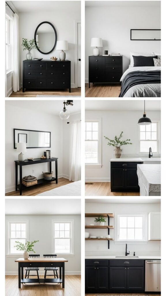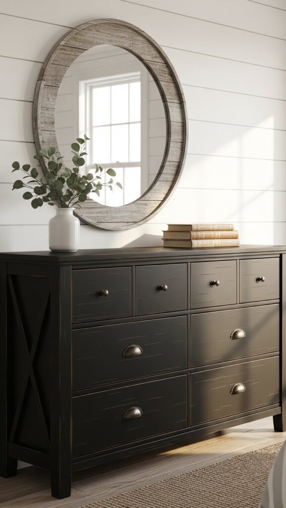 A black dresser can be the hero piece of your farmhouse bedroom if you pick the right style. Dressers with vintage hardware, distressed edges, or barn-door style panels fit perfectly with the rustic vibe. If you want a more modern farmhouse feel, go for a clean-lined dresser with matte black handles. Styling the top is just as important — add a wooden tray, a metal lamp, some ceramic pieces, a small lantern, or a framed mirror to make the dresser instantly Pinterest-worthy. A black dresser also grounds the room, especially if your bed or bedding is on the lighter side.