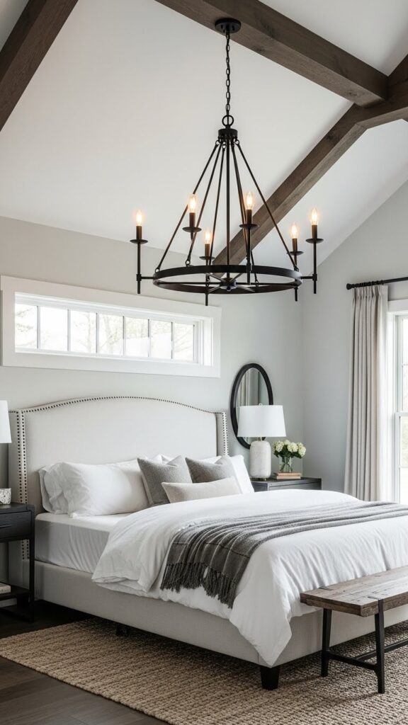 A chandelier instantly elevates a black farmhouse bedroom and gives it that stunning focal point. Wrought iron, distressed wood, or mixed metal chandeliers feel the most authentic to the farmhouse look. Candle-style chandeliers add vintage charm, while circular wagon-wheel designs give a rustic yet modern feel. When paired with black accents throughout the room, a chandelier becomes even more striking—especially if it hangs over a wooden bed or a textured rug. The key is picking a chandelier that complements your furniture style without overpowering the room’s cozy tone.