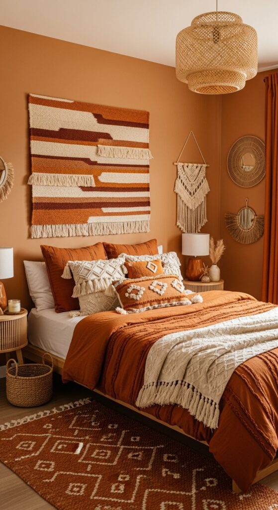 Natural Materials and Textures: Materials like wood, wicker, rattan, and jute bring nature indoors. Pair them with warm textiles and handcrafted décor to enhance the organic feel. These elements complement the burnt orange color palette beautifully, giving your bedroom a grounded yet stylish look.