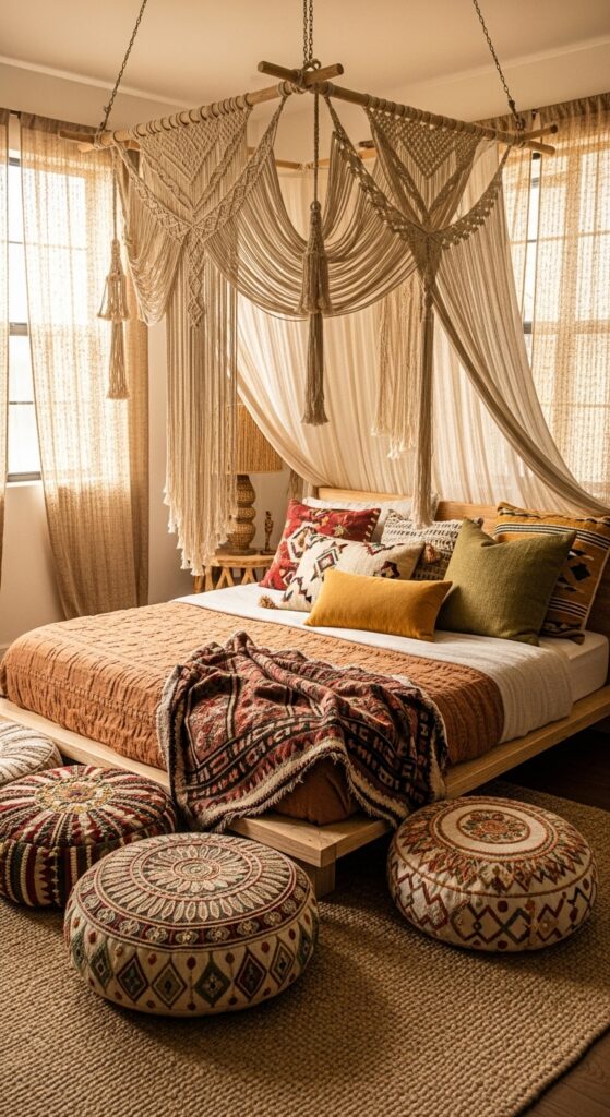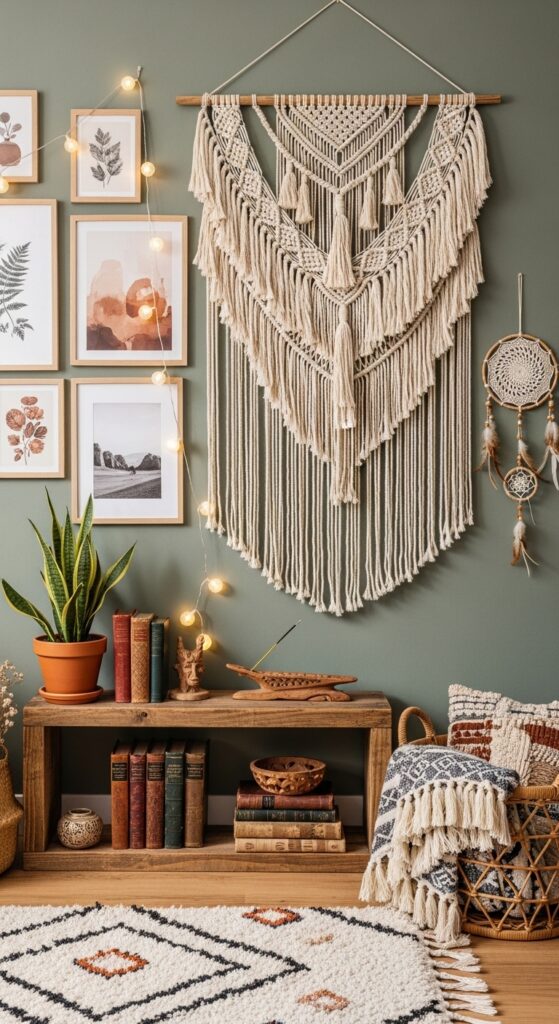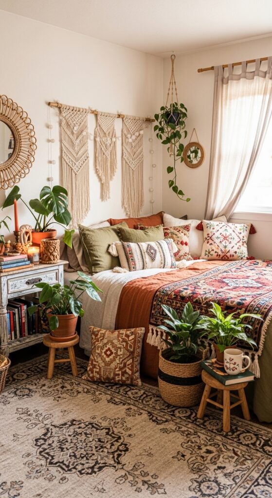 Macramé Wall Art: Macramé adds texture and a handcrafted touch, reinforcing the bohemian aesthetic. Hang one above the bed or in a reading nook for impact.