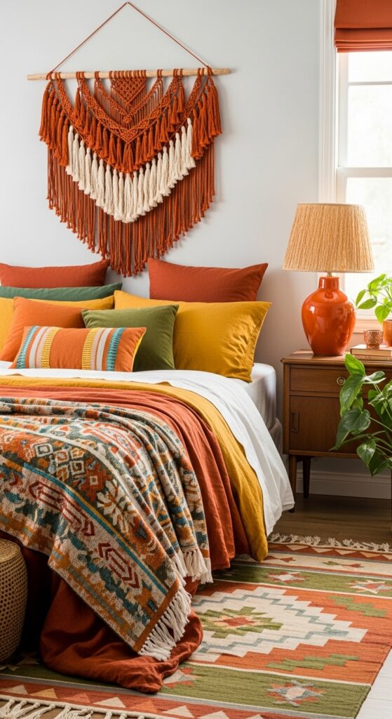 Layered Textiles: Rugs, throws, and bedding are essential. Mix patterns, textures, and colors to achieve that signature boho feel. Think patterned Moroccan rugs, cozy wool throws, and linen bedding that adds dimension to your burnt orange walls or accents.
