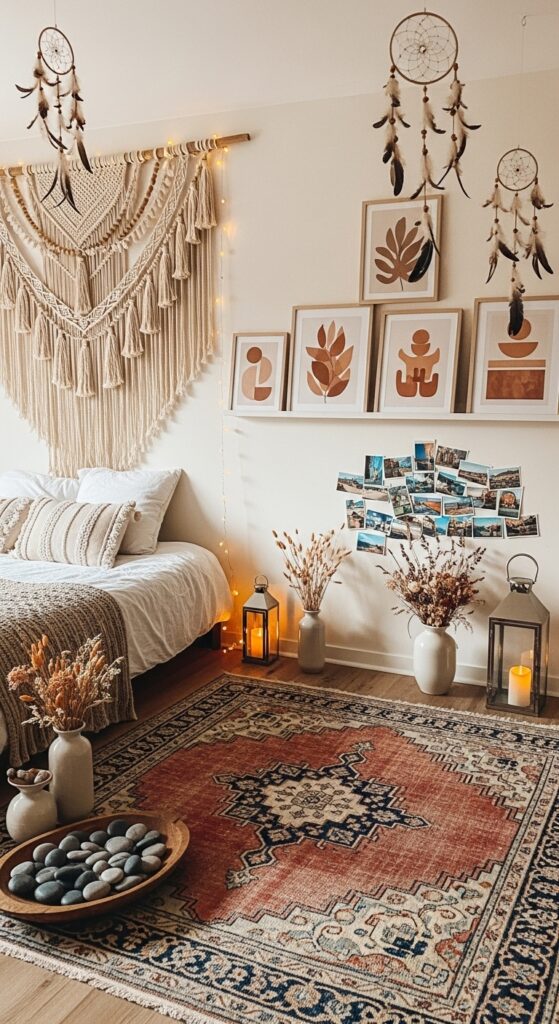 Boho Rugs and Wall Hangings: Large patterned rugs anchor the space and provide warmth underfoot. Layering rugs in different textures and colors adds depth. On the walls, macramé hangings, woven tapestries, or handmade art pieces reinforce the bohemian aesthetic.