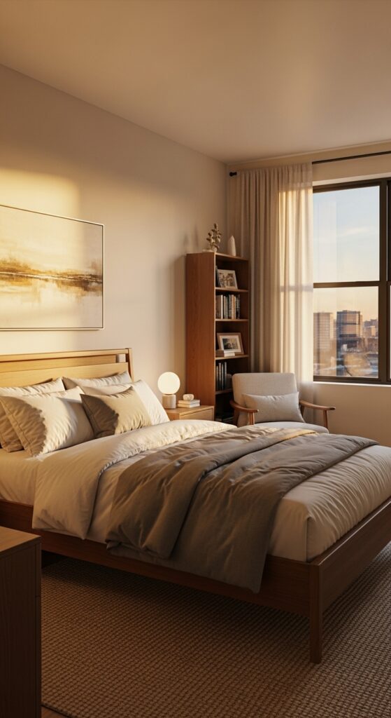 Ambient Lighting Tips: Lighting is key in creating a cozy atmosphere. Consider soft, warm lights with string lights, lanterns, or floor lamps. A combination of natural light during the day and layered lighting at night will make your bedroom feel inviting and serene.
