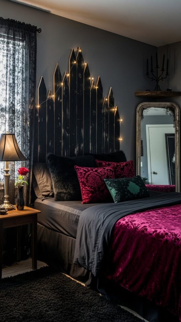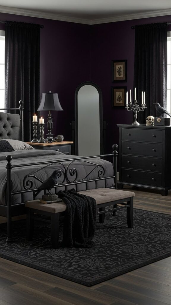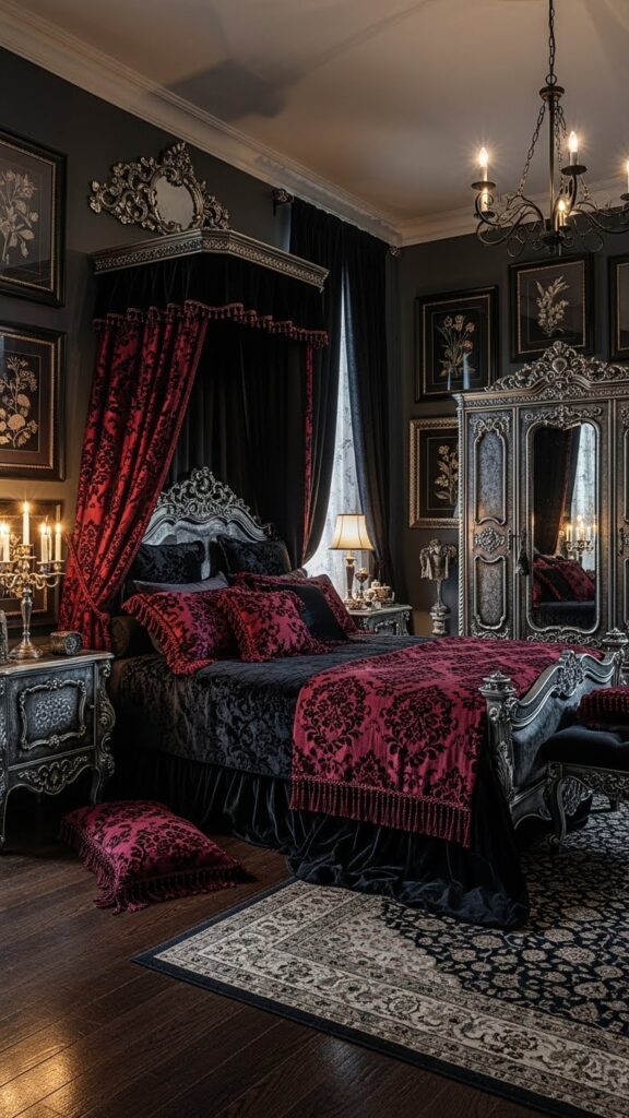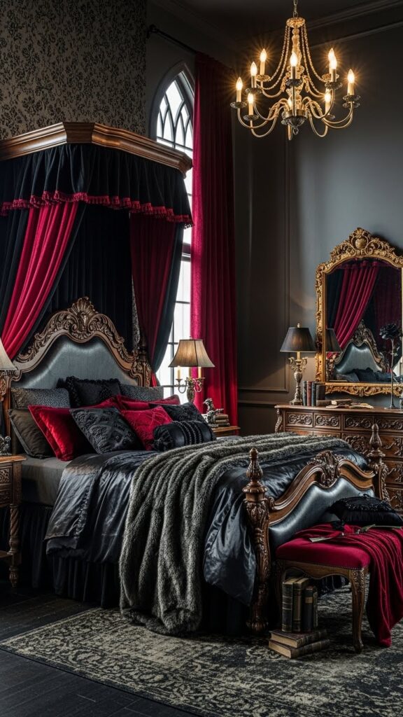 Little details complete your gothic bedroom vision. Add dim lighting, string lights in warm tones, layered rugs, and vintage-style curtains for full atmosphere. Mirrors with ornate frames make the space feel larger and richer. Small gothic statues or book stacks add personality without breaking your budget. When you mix texture, light, and color, your entire room feels like a dark romantic retreat.
