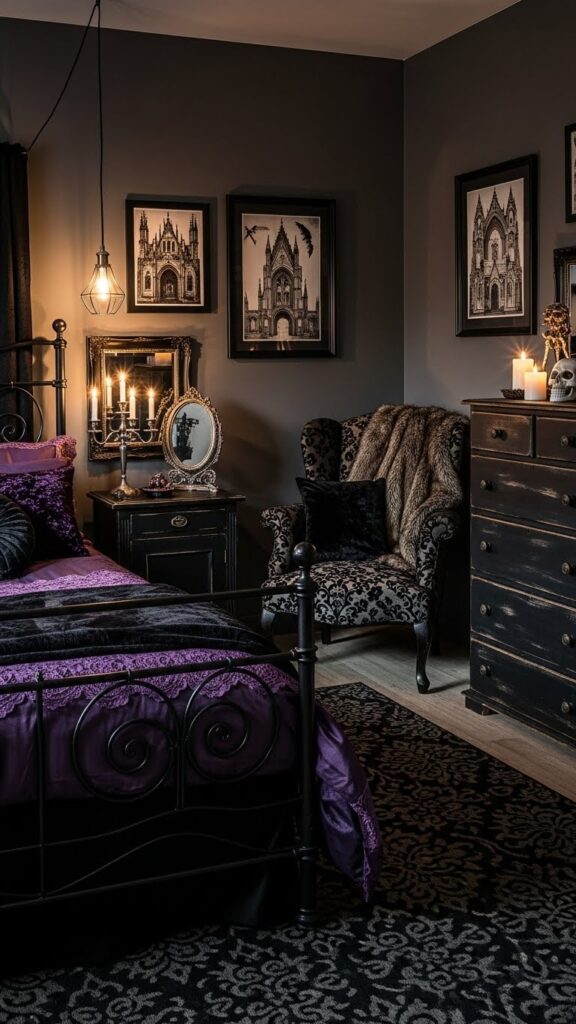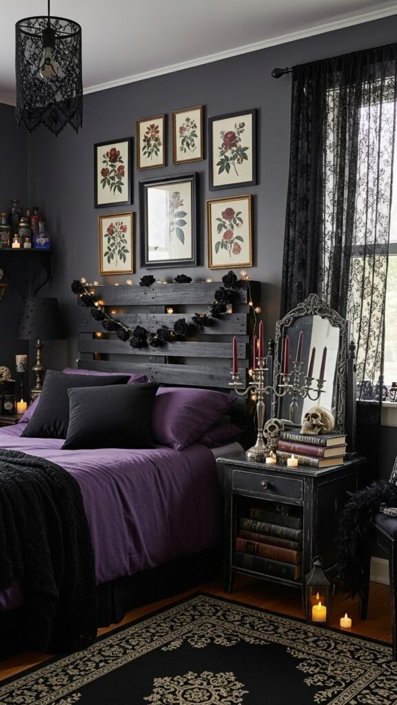 Accessories make your gothic bedroom feel alive. Try adding skull candles, black lace runners, ornate trays, dark art prints, or tarot-inspired wall décor. You can find many of these items at low prices online. Velvet throws, faux fur blankets, and deep-colored pillows add luxurious texture. Candles—especially tall ones—create that medieval vibe instantly. Even curtain tiebacks, bedding, and lamp shades can shift the mood dramatically. With the right accessories, you don’t need expensive furniture at all.