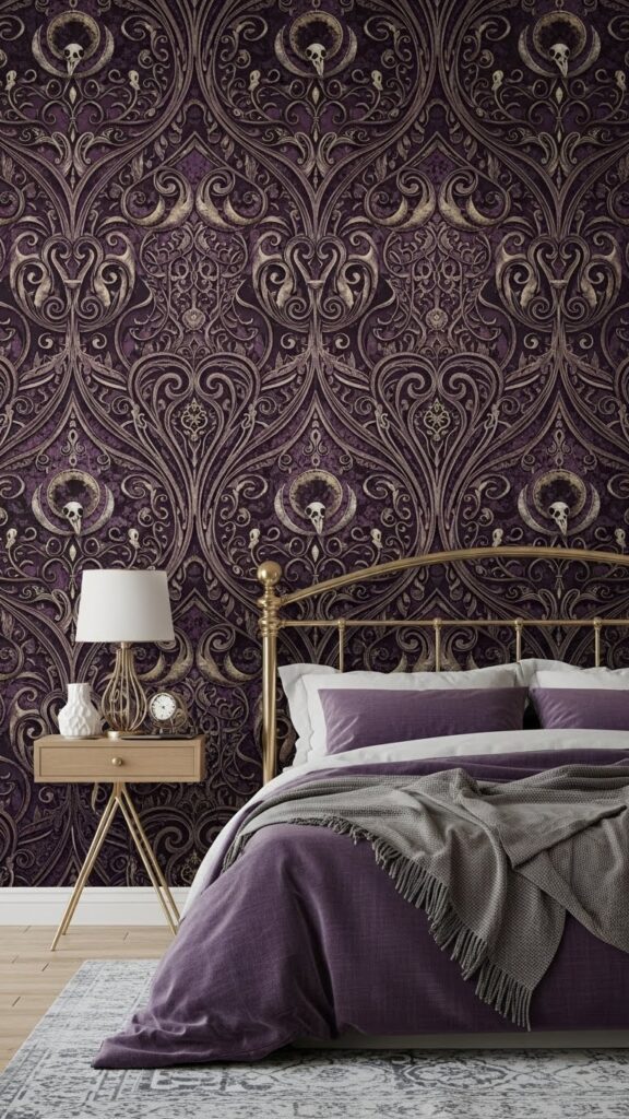 Wallpaper is one of the easiest ways to create gothic drama without buying new furniture. Choose patterns like damask, baroque, dark florals, or black-on-black textures for a high-end look. Peel-and-stick wallpaper is budget-friendly and renter-friendly. Accent walls work beautifully—just one wallpapered wall behind the bed can completely shift the vibe. Dark patterns add depth, making the room feel luxurious and moody even if the rest of the décor is minimal.