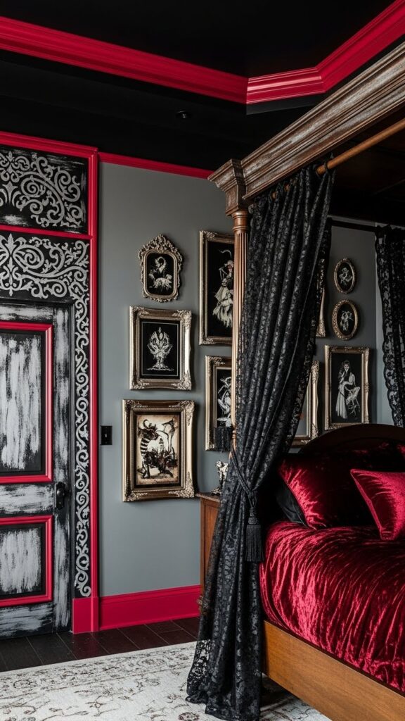 If wallpaper isn’t your style, paint works wonders for gothic bedrooms. Matte black is a classic, but charcoal, deep plum, forest green, or blood-red shades also create dramatic effects. Painting just one wall still transforms the room. Dark ceilings also look stunning if you want a full gothic effect. Add gold accents, candlelight, or velvet fabrics to balance the depth of the color. Paint is one of the cheapest ways to get that rich gothic look.