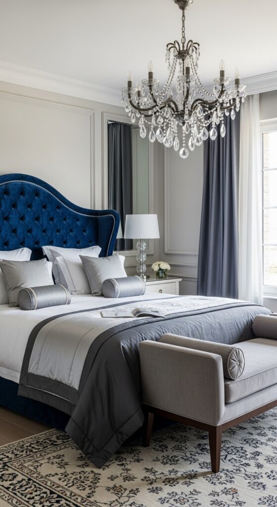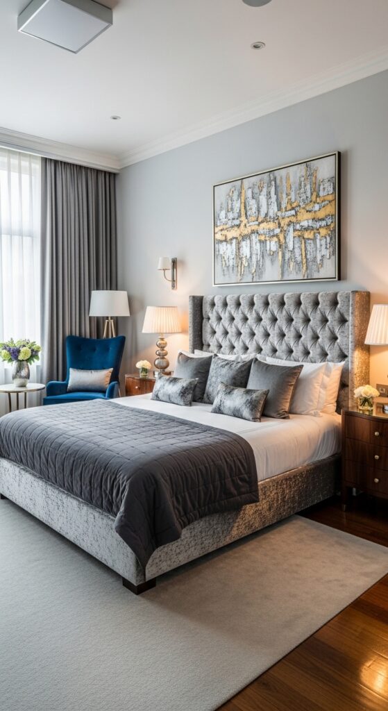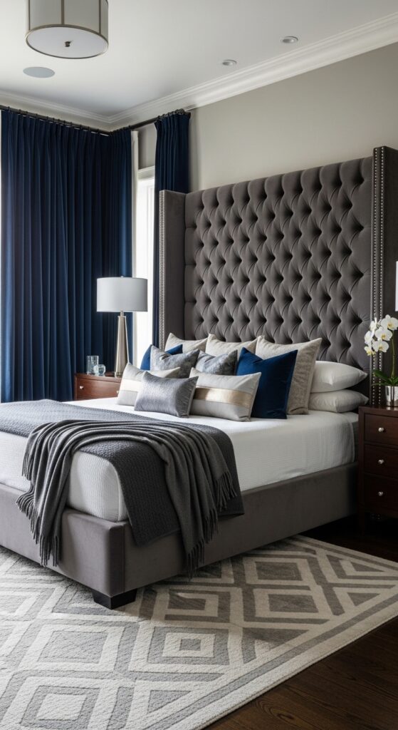 An upholstered headboard in velvet, linen, or suede adds instant elegance. Tall headboards create a sense of grandeur and make the ceiling appear higher. Tufted designs feel classic and refined, while sleek, paneled headboards lean toward modern luxury.