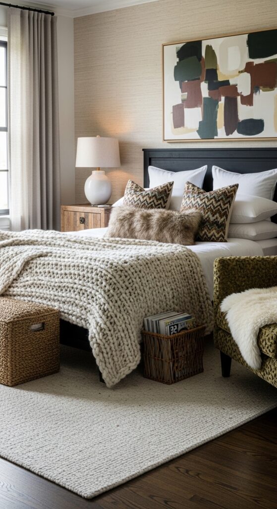 Layered bedding also plays a crucial role. Crisp sheets, a plush duvet, decorative pillows, and a textured throw blanket create depth and visual interest. Think of your bed as the centerpiece — everything else in the room should support it.
