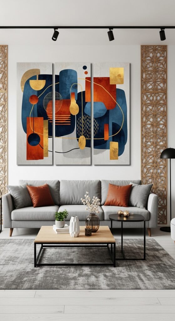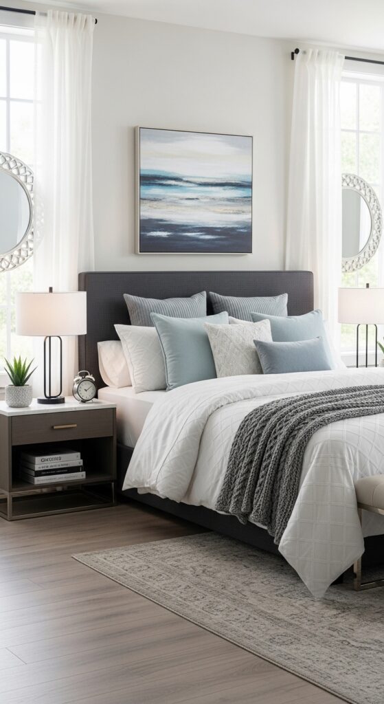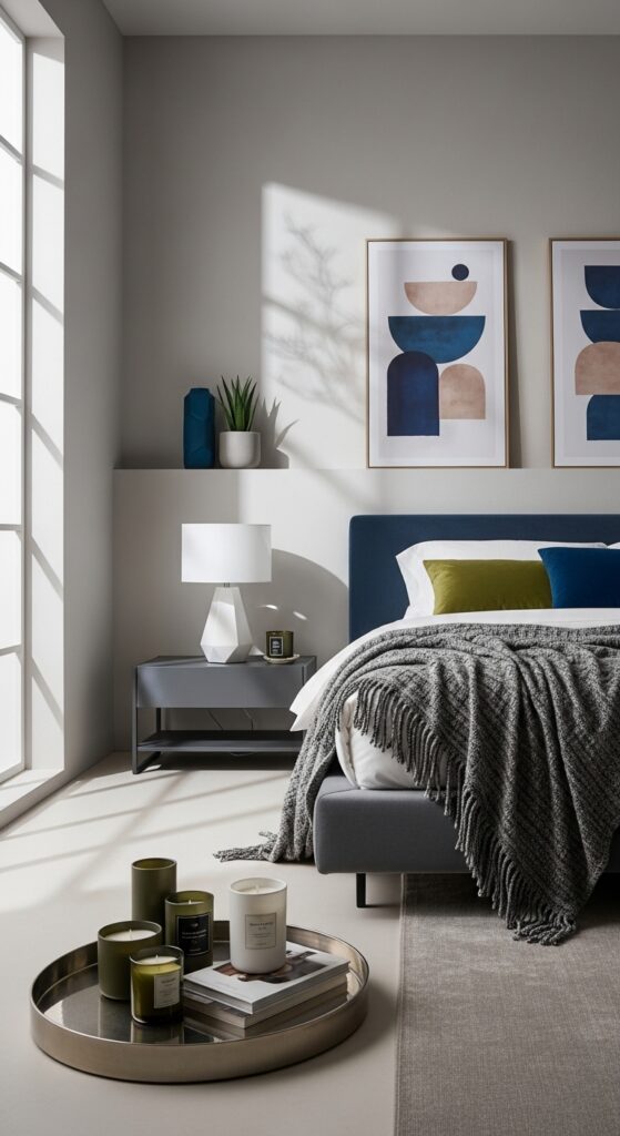 Walls offer an opportunity to introduce personality without cluttering surfaces. Large-scale abstract art, black-and-white photography, or minimalist prints are perfect modern bedroom decoration items that add sophistication.