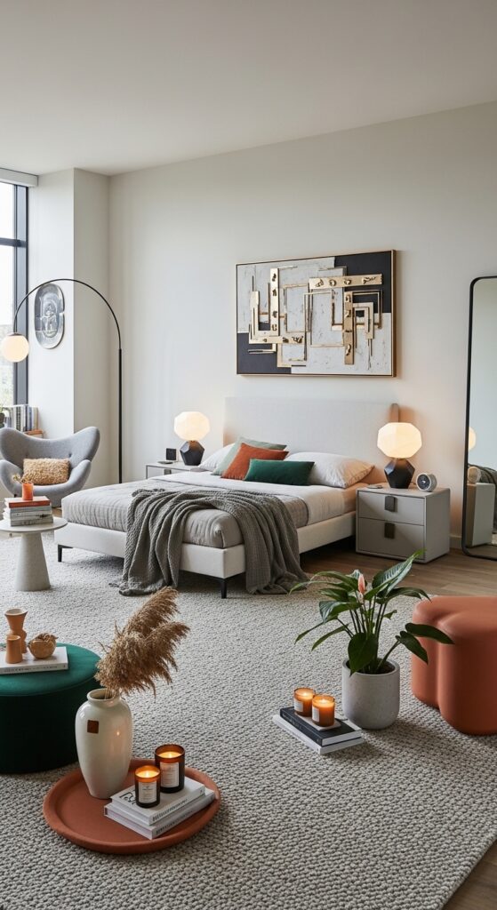 Texture is essential in modern design. Without it, a bedroom can feel flat or sterile. Area rugs are versatile modern bedroom decoration items that bring warmth and softness underfoot.
