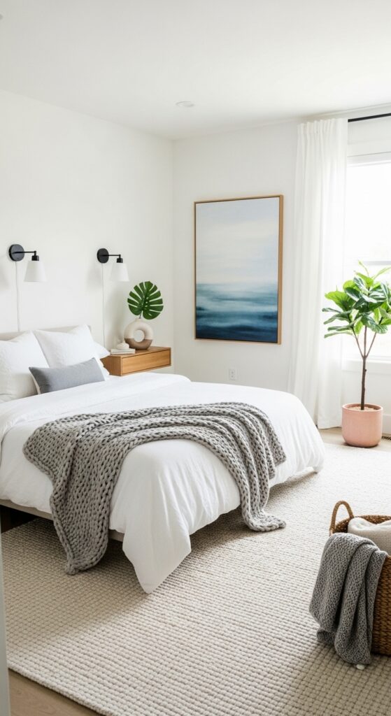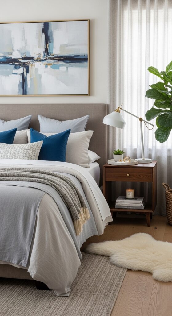 Instead of multiple small frames, opt for one oversized artwork above the bed. This creates a focal point and enhances the room’s scale. If you want something more architectural, consider wood slat panels or textured wall treatments that add dimension without overwhelming the space.