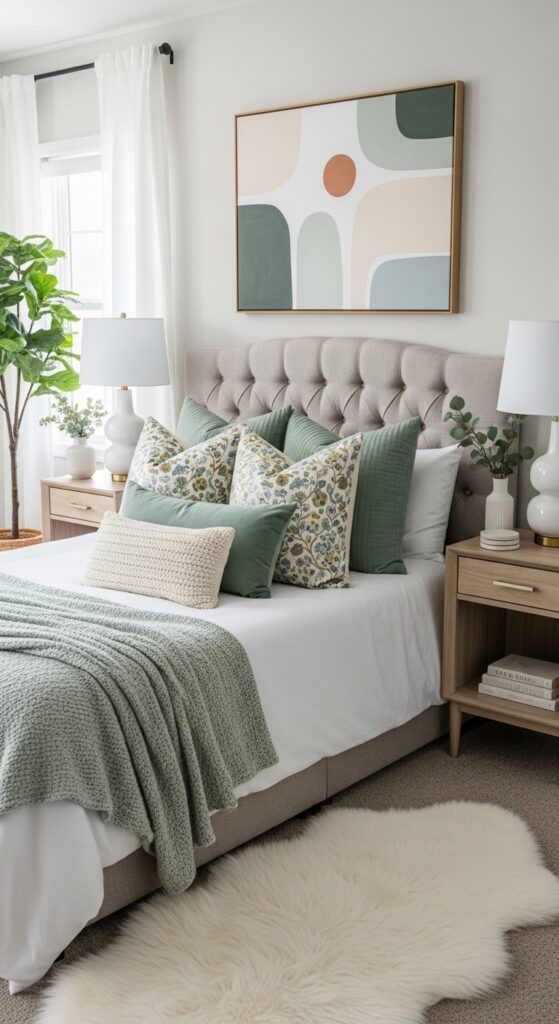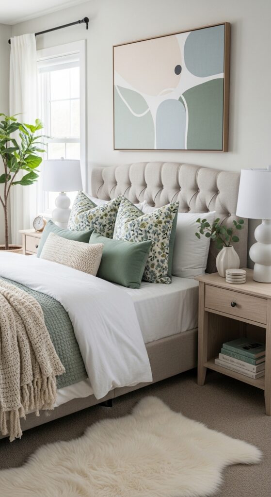 A modern upholstered headboard in linen, velvet, or leather can instantly elevate your bedroom. Look for clean lines, geometric shapes, or subtle vertical channel detailing. Neutral tones such as beige, gray, cream, or muted green work beautifully in contemporary spaces.