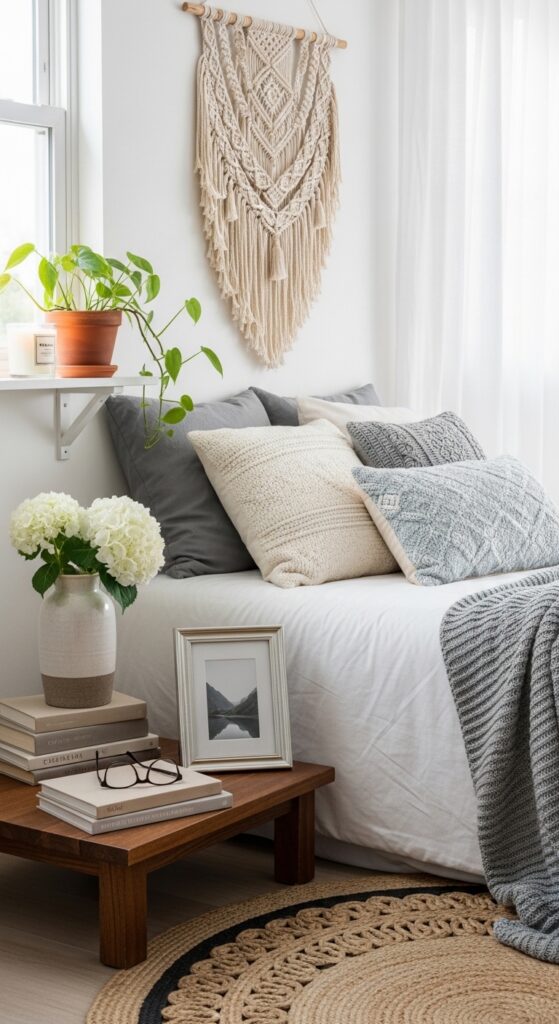 Consider decorative trays, sculptural vases, ceramic bowls, or metallic candle holders. Books stacked neatly on a nightstand can add character without clutter. Indoor plants are another excellent addition. They introduce freshness and contrast against neutral tones.