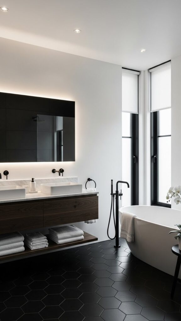 Small bathrooms ke liye white dominant rakhna behtar hota hai, aur black ko accents ki tarah use kiya jata hai. Larger bathrooms mein aap black walls, tiles ya vanities ke sath experiment kar sakte ho. Balance ka rule simple hai: jo cheez space ko open banaye, usay zyada rakho.