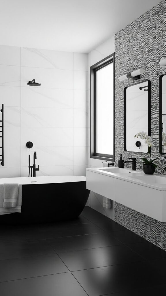 Black and white bathroom decor ka charm kabhi purana nahi hota. Ye color combination clean, sharp aur effortlessly stylish lagta hai, chahe bathroom chota ho ya spacious. Is palette ki sab se bari strength ye hai ke ye modern bhi lagta hai aur classic bhi, isliye trend change hone ke bawajood outdated feel nahi deta. Jab light aur dark ka balance sahi ho, to bathroom instantly high-end look dene lagta hai.