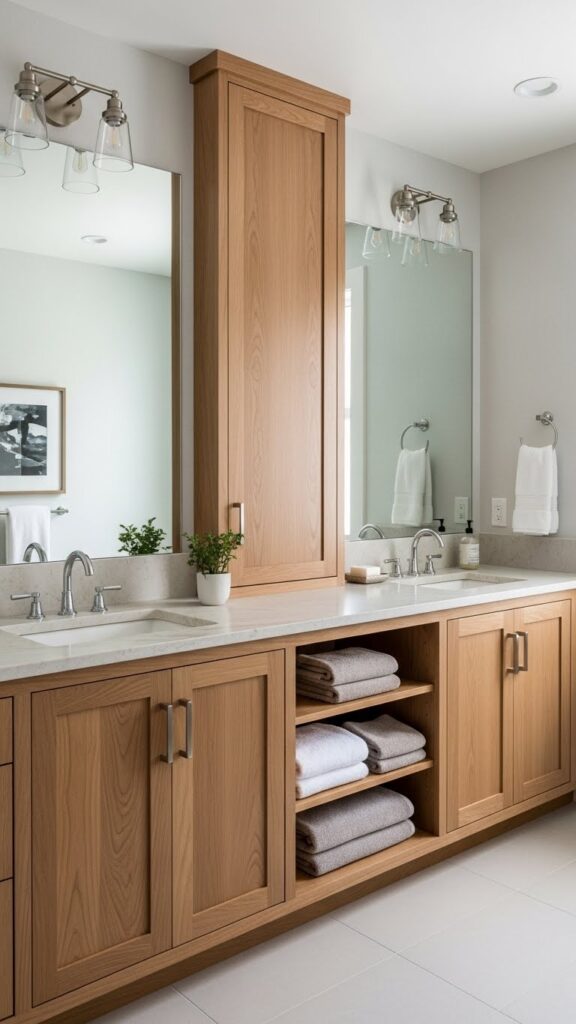 Cabinets me subtle hardware aur minimal design prefer karo. Neutral bathrooms me uncluttered storage essential hai, taake space calm aur organized feel kare. Textured wood ya matte finishes accents ko highlight karte hain aur depth add karte hain.