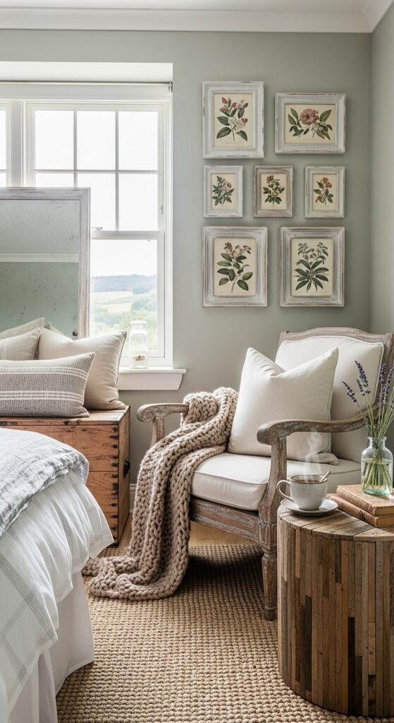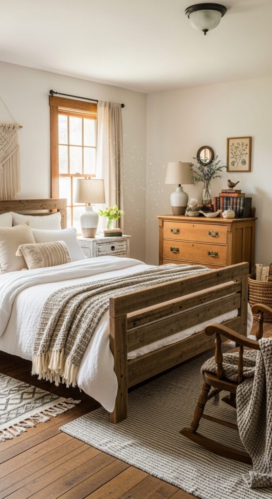 If you have a little extra space, creating a cozy seating corner instantly elevates the romantic vibe. Many romantic cozy farmhouse bedroom images show a small armchair, rocking chair, or bench near a window. Add a throw blanket, a soft cushion, and a small side table with a vase or candle to complete the look. This spot becomes the perfect reading corner or a peaceful place to unwind in the evening. Light-colored fabrics and rustic wood furniture make the space feel warm, inviting, and picture-perfect.