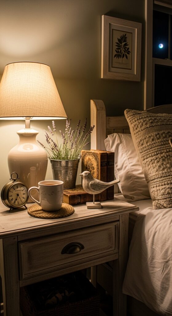 Your nightstand can transform your bedroom’s overall charm when styled with intention. Romantic cozy farmhouse bedroom images often show nightstands decorated with simple yet thoughtful items like ceramic lamps, antique books, small plants, or lace doilies. Keep the color palette soft and neutral, and avoid overcrowding the space. A candle in a vintage holder, a floral coaster, or a small wicker basket for storage can enhance the aesthetic effortlessly. Styling your nightstand the right way ties together the entire farmhouse atmosphere.