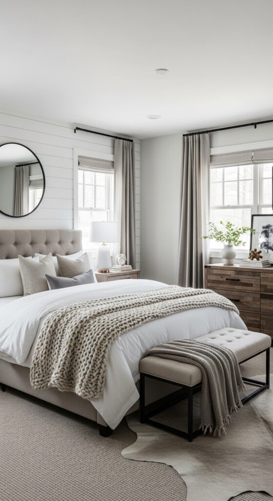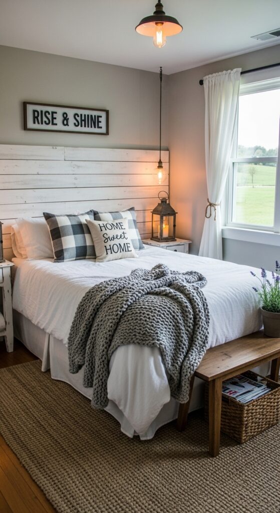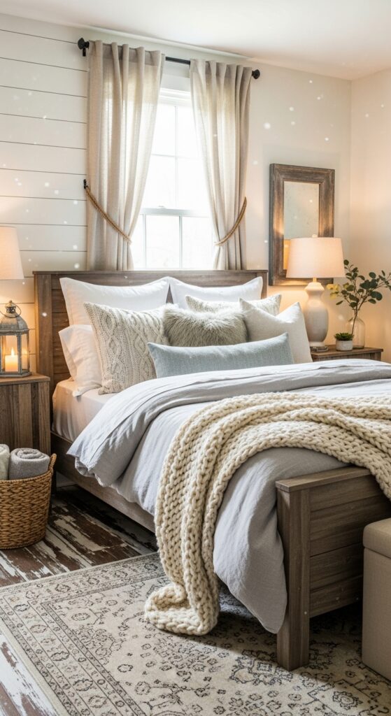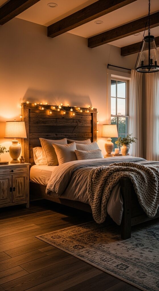 One of the best things about farmhouse décor is that it blends beautifully with modern touches. Many romantic cozy farmhouse bedroom images show spaces that balance rustic wood with modern lighting, sleek mirrors, or minimal décor. Modern farmhouse style feels fresh and clean while keeping the rustic charm alive. Use clean-lined furniture along with vintage accessories or add a modern chandelier above a distressed wooden bed frame. This mix gives your room a trendy yet romantic feel, perfect for Pinterest-style bedroom inspiration.