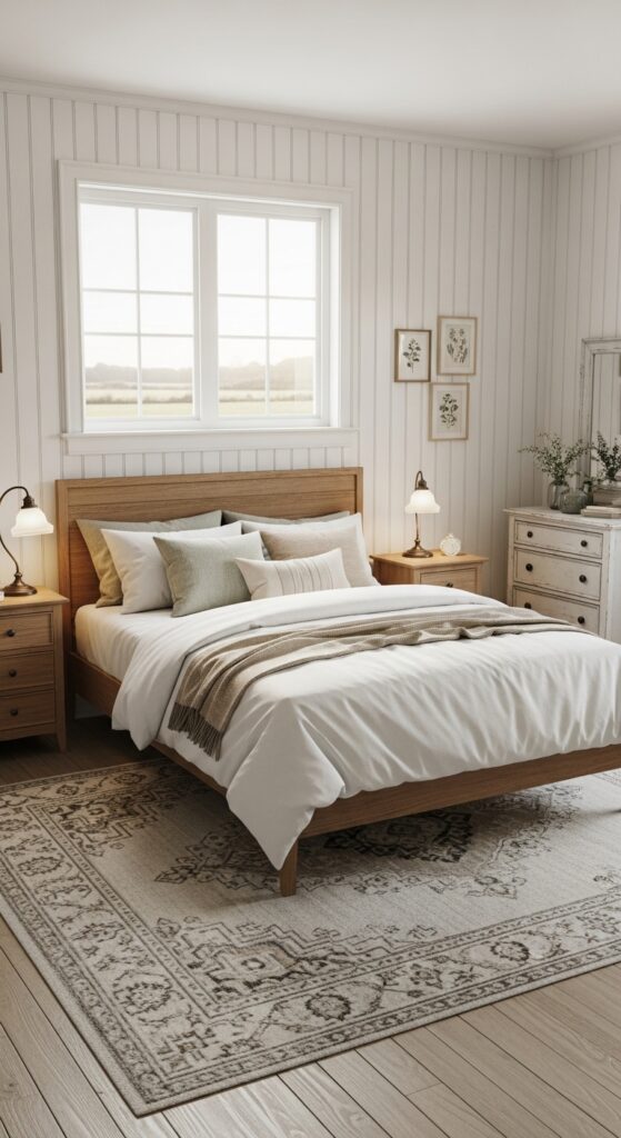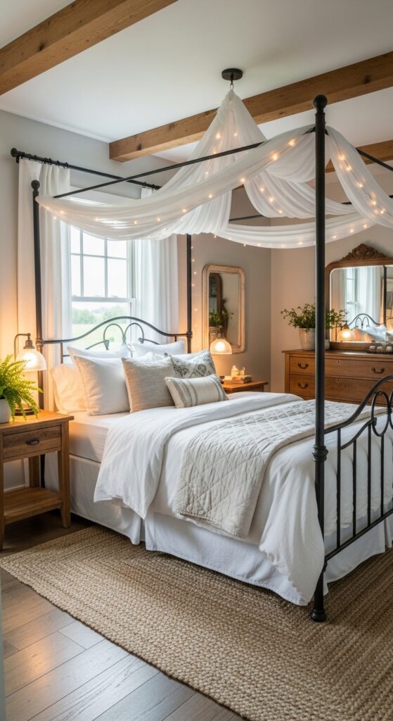 A romantic farmhouse bedroom often features iconic bed styles like canopy frames or wrought iron beds. These styles appear frequently in romantic cozy farmhouse bedroom images because they instantly add charm and elegance. A simple white canopy with soft, flowy fabric can transform an ordinary bed into a dreamy retreat. Iron bed frames, especially black or distressed white, bring a strong farmhouse feel while keeping the design timeless. If you want a romantic atmosphere, choose curved iron frames or vintage-style details. Pair the bed with layered bedding and soft lighting for a magazine-worthy farmhouse bedroom.