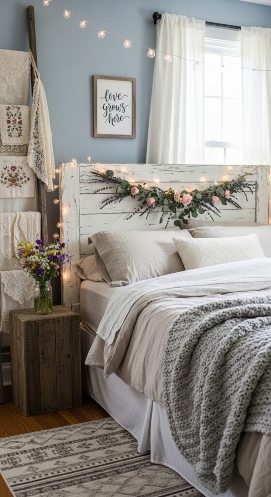 You don’t need a huge budget to recreate the style in romantic cozy farmhouse bedroom images. Simple DIY projects like distressing an old dresser, painting a mirror frame white, or creating a rustic wooden shelf can make a big difference. Try making your own chunky knit blanket, adding lace trim to plain curtains, or creating a dried flower arrangement using local blooms. These small DIY touches add personality and charm to your bedroom without spending a lot of money.