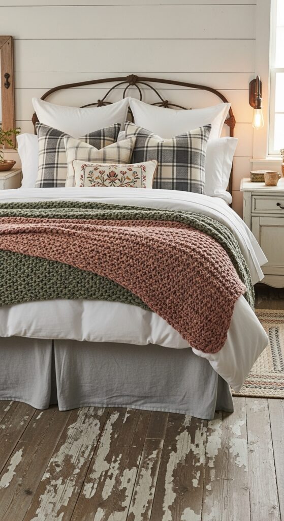 If you look closely at romantic cozy farmhouse bedroom images, you’ll notice the bedding is always layered with multiple textures to create depth. Start with a soft cotton or linen base sheet and add chunky knit blankets, quilts, faux fur throws, or flowy comforters on top. Layering not only increases comfort but also enhances the romantic feel of the space, making the bed the center of attention. Use a mix of neutral colors and subtle patterns like stripes, florals, or gingham to maintain the farmhouse aesthetic. The best part is that layered bedding makes the room look professionally styled—like something straight out of a Pinterest board—while still keeping everything practical and cozy for everyday use.