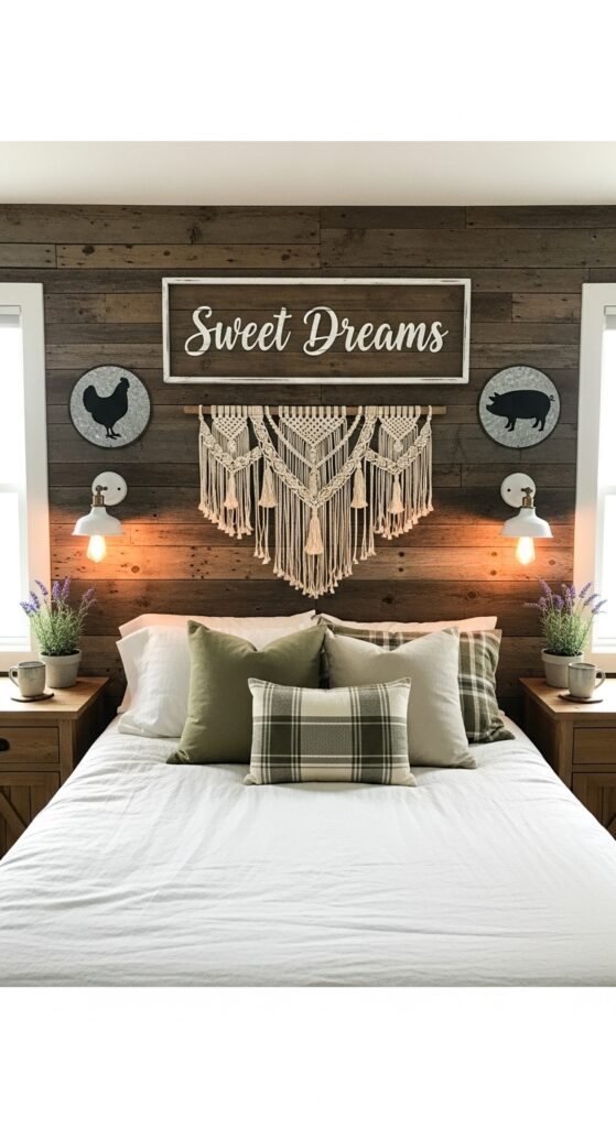 Wall décor is another big part of farmhouse design, and it brings personality into your bedroom. When you search for romantic cozy farmhouse bedroom images, you’ll often see walls decorated with wooden frames, botanical prints, inspirational quotes, or soft floral artwork. Try using distressed wooden panels as wall art or add a simple gallery wall with black-and-white photos that reflect simplicity and sentimental memories. Woven baskets, hanging greenery, and antique mirrors also make great additions. If you prefer something subtle, use soft textured wallpapers like vintage floral patterns or linen-like finishes. These small touches can dramatically elevate your space while keeping the aesthetic warm and nostalgic.