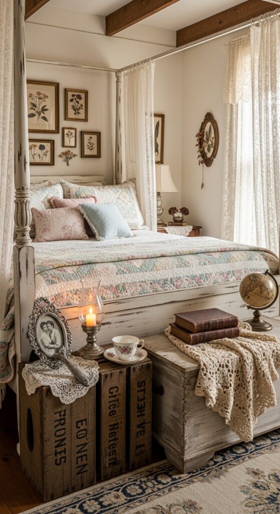 Antique accessories bring timeless elegance into farmhouse bedrooms. If you observe romantic cozy farmhouse bedroom images, you’ll notice small vintage items placed carefully throughout the space—like brass candle holders, classic alarm clocks, floral ceramics, lace runners, or old books stacked charmingly on the nightstand. These pieces add a sense of history and romance while keeping the farmhouse theme authentic. Flea market finds, thrift store treasures, and family-passed items can all become meaningful décor pieces. These antique details tell a story, making the bedroom feel personal and emotionally warm. Adding just a few accessories is enough to create a soft nostalgic vibe.