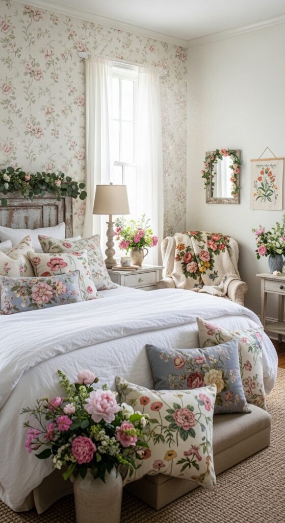 Florals are one of the most powerful elements for adding a romantic touch to farmhouse bedrooms. In many romantic cozy farmhouse bedroom images, you’ll see floral prints on bedding, curtains, artwork, or even dried bouquets placed on wooden nightstands. Soft floral designs—especially in blush, cream, lavender, or muted greens—enhance the romantic atmosphere without overwhelming the room. You can also place a vase of fresh or dried flowers near the window for a natural touch. Botanical patterns bring life and color into the room, perfectly balancing rustic wood textures with feminine warmth.
