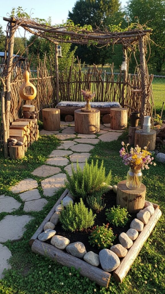 Even tree stumps ya wooden logs tables ki tarah use kiye ja sakte hain. Ye cheap bhi hote hain aur rustic vibe ko naturally enhance karte hain.