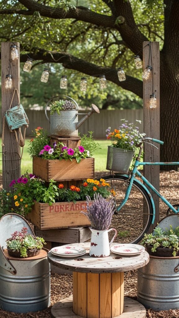 Rustic backyard decor mein DIY ideas bohat kaam aate hain. Old buckets ko planters bana lo, glass jars ko lanterns ki tarah use karo, ya wooden crates ko side tables bana do. Ye cheezen na sirf cheap hoti hain balkay backyard ko personal touch bhi deti hain.