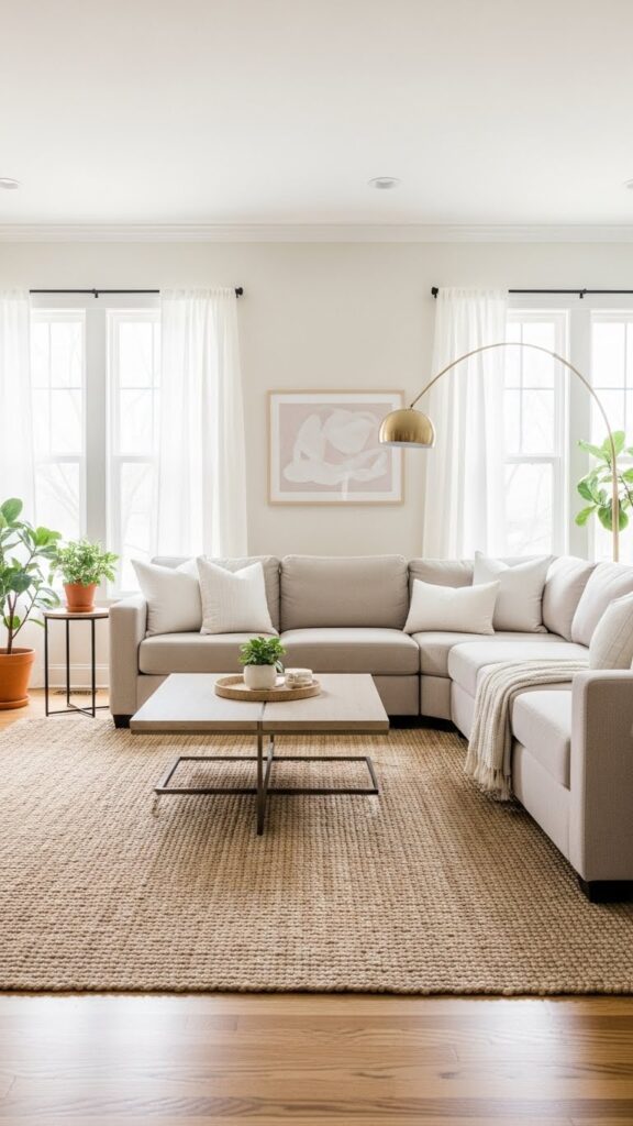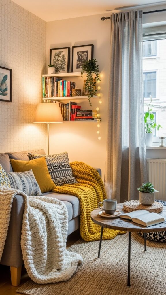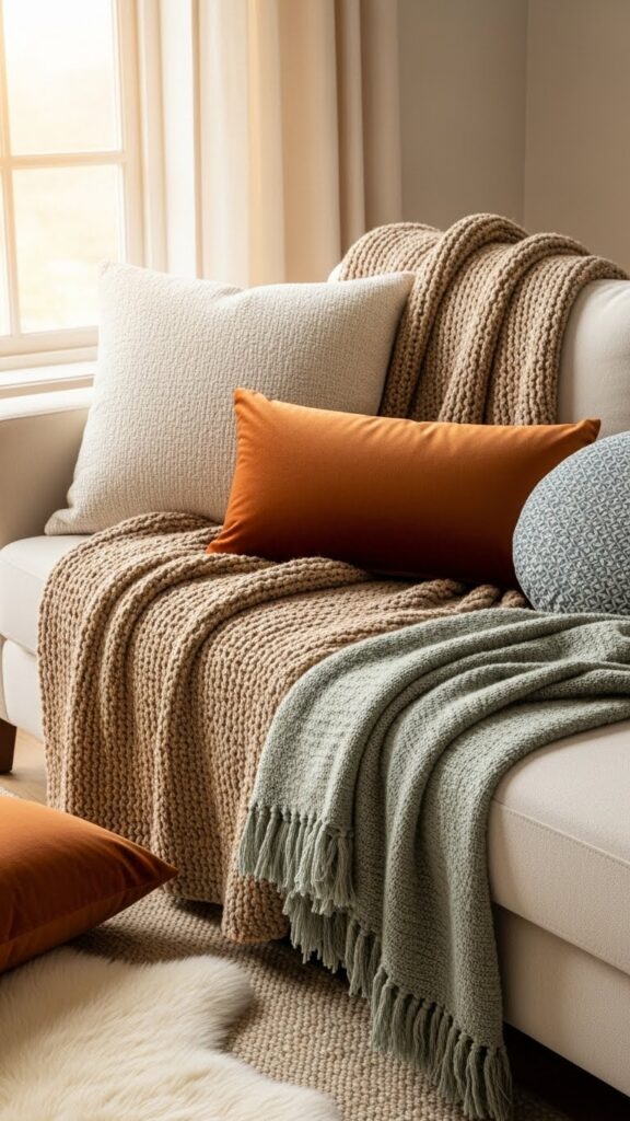 Layering throw blankets and cushions in a small living room instantly boosts coziness. Mix different textures like wool, faux fur, linen, or velvet in complementary neutral shades. This layering creates depth, visual interest, and tactile comfort, encouraging relaxation. You can drape a chunky knit blanket over the sofa and scatter a few soft pillows to achieve a lived-in, welcoming look. In a small space, this simple addition makes a dramatic impact on the overall cozy aesthetic.