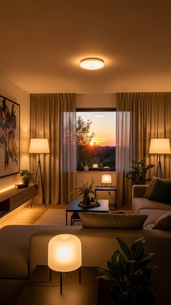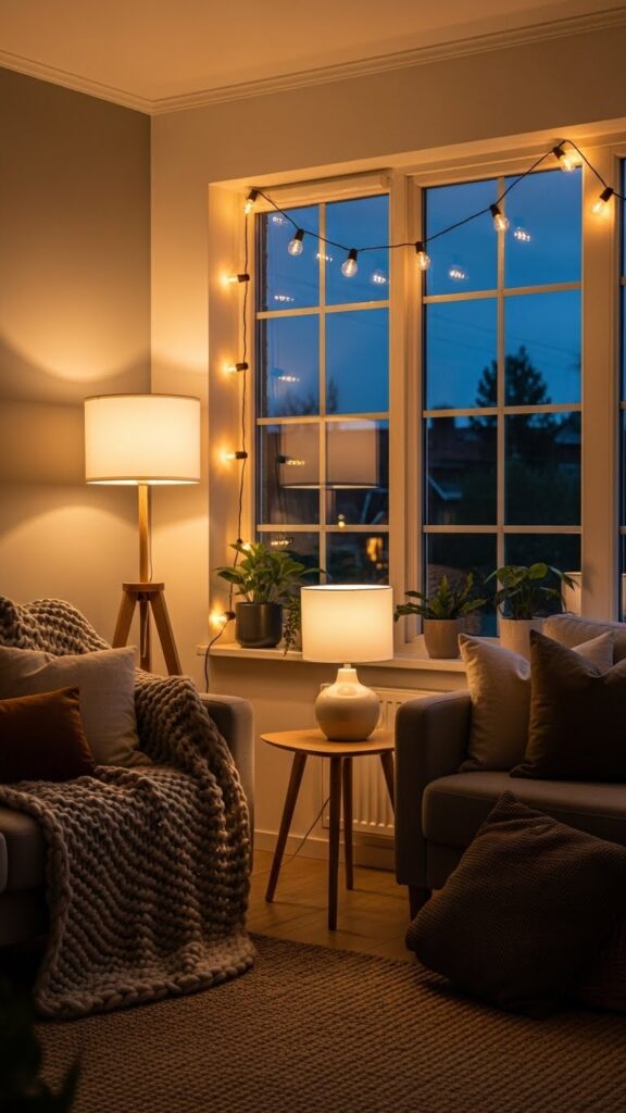 Lighting plays a major role in creating a cozy aesthetic, especially in small apartments where natural light may be limited. Using a mix of ambient, task, and accent lighting creates a warm, welcoming environment. Soft LED lights, table lamps, floor lamps, and string lights can soften shadows and add a warm glow. Positioning light sources strategically near seating areas, shelves, and decorative accents helps the room feel inviting. Warm lighting also enhances neutral colors and textures, making the entire space feel more comfortable and relaxing.