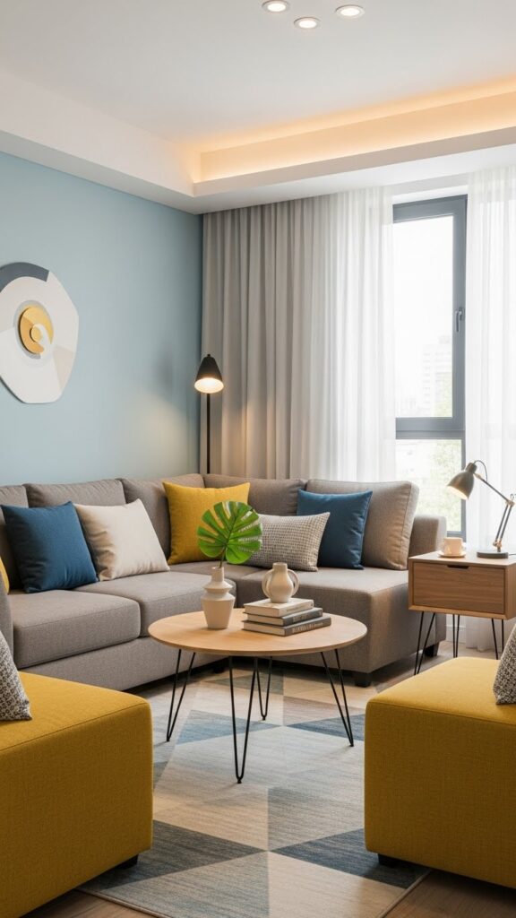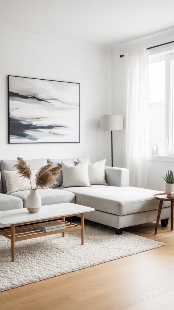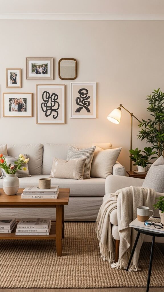 Even a small living room can feel personal and inviting with carefully selected accessories. A couple of framed family photos, a neutral-toned decorative vase, or a favorite small sculpture can make the space feel like home. The key is moderation—choose meaningful items that complement your color palette and style. Personal touches make your small apartment living room cozy and lived-in without compromising the open, calm aesthetic