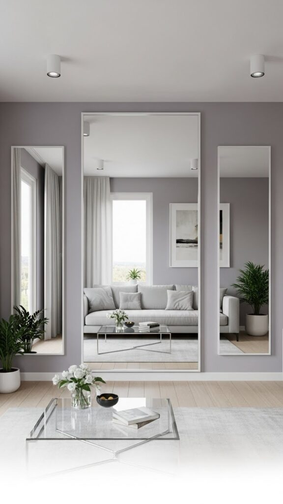 Mirrors are a small apartment designer’s best friend because they create the illusion of more space while reflecting light. A large wall mirror or several smaller decorative mirrors can make your living room feel brighter and more open. Mirrors also enhance the cozy aesthetic by visually balancing furniture and décor. Simple frames in wood, metal, or neutral tones complement the layered textures and color palette. Strategically placing mirrors across from windows amplifies natural light, making the room feel airy yet intimate.