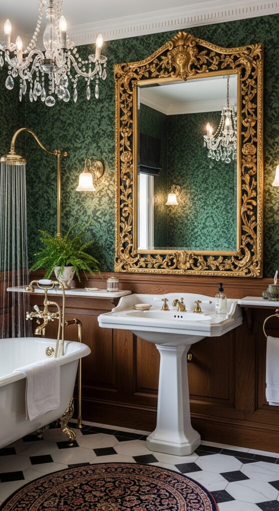 Wallpaper can work wonders in a tiny bathroom where paint alone doesn’t feel enough. Gothic-inspired wallpaper—featuring damask patterns, baroque prints, moody florals, or Victorian motifs—instantly sets the tone. You don’t need to cover all the walls; even a single statement wall can be transformative. Dark wallpaper adds richness, texture, and dimension, making the room feel more elaborate without needing lots of décor. Peel-and-stick wallpaper works perfectly if you’re renting or prefer an easy upgrade without committing to something permanent.