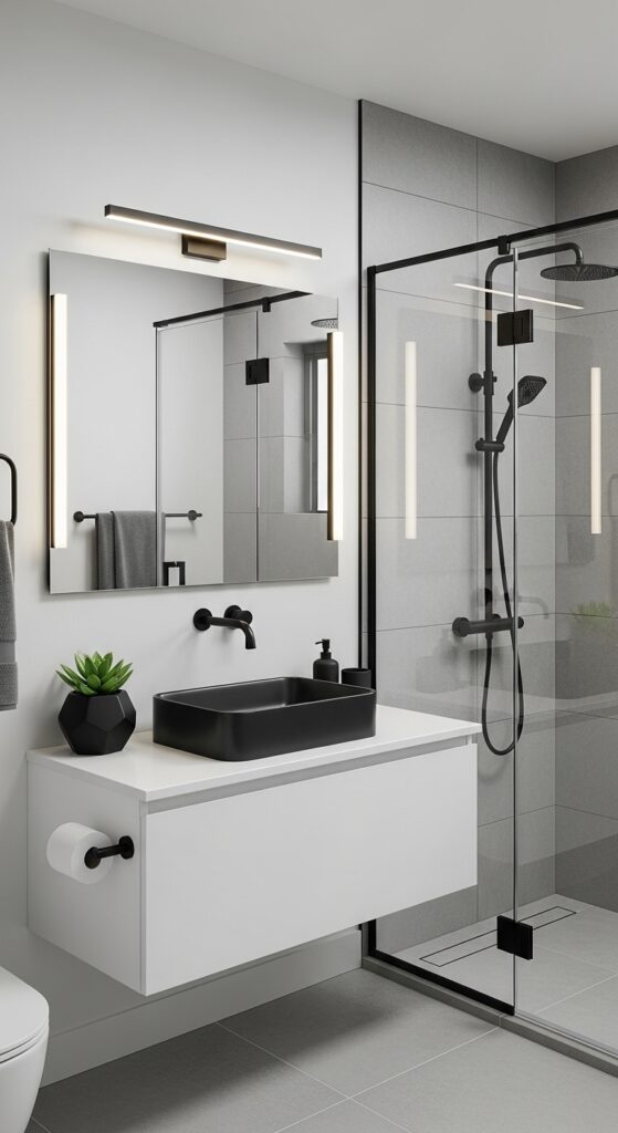 Gothic spaces have never relied on bright lighting; instead, they thrive on soft glows and shadowy corners that create mood. For a small gothic bathroom, aim for layered lighting—think warm sconces with candle-style bulbs, a low-hanging mini chandelier, or LED strips hidden under shelves to cast a subtle glow. The lighting should feel atmospheric rather than harsh, so warm tones (2700K–3000K) work best. Even a small candle lantern or faux flickering candle can add that old-world charm without needing much space. Soft, diffused lighting enhances the dark color palette and adds dimension to every detail, turning even a compact bathroom into a dramatic little sanctuary.