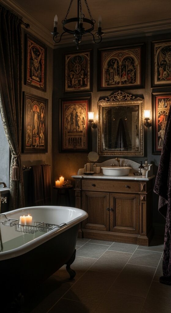 Art plays a huge role in adding personality to a small gothic bathroom. The secret is choosing pieces that feel mysterious, vintage, or atmospheric. Think botanical illustrations in black ink, gothic architecture sketches, moody landscapes, or baroque-style floral prints. Dark frames help the pieces blend into the overall palette, and even two or three small artworks can tell a complete story. Because bathrooms are usually high-moisture environments, go for framed prints rather than canvas pieces to keep everything safe and long-lasting. Hanging art above the toilet, beside the mirror, or on narrow wall spaces helps fill empty spots without crowding the room.