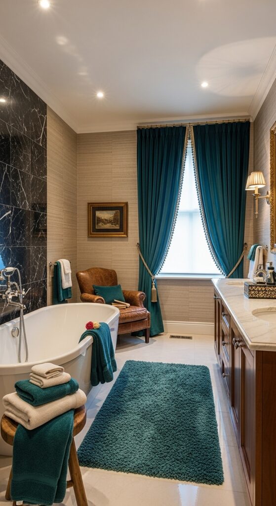 In a small bathroom, the shower curtain often becomes the largest visible element, which makes it the perfect tool for adding gothic flair. A black lace-inspired curtain, dark florals, baroque patterns, or deep jewel-tone fabrics can instantly create drama. If you want something bolder, choose a curtain with gothic architecture prints, moon phases, Victorian motifs, or antique botanical art. A single statement piece here can overpower plain walls and give your bathroom a bold personality without needing major changes elsewhere. Think of the shower curtain as your “main character moment” in the whole design.