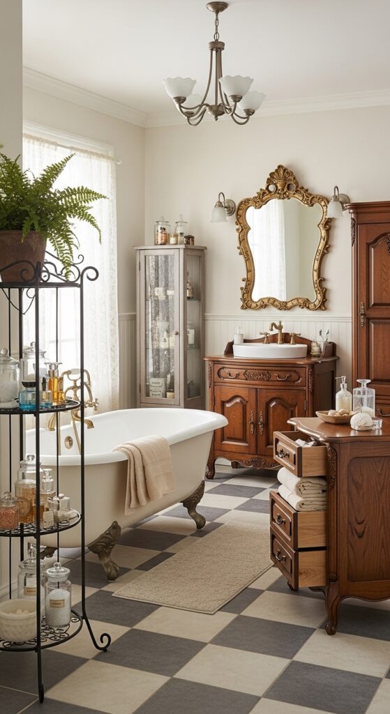 Mirrors are already essential in small bathrooms, but when you’re leaning into the gothic theme, they become more than just functional—they become part of the story. Choose mirrors with ornate frames, vintage carvings, bronze or black finishes, or oval-shaped silhouettes that whisper a little Victorian charm. A single oversized mirror can instantly elevate the entire bathroom, bouncing whatever light you have around the space while still keeping the aesthetic moody. The trick is to avoid overly modern pieces; instead, look for antique replicas or thrifted frames that carry more texture and detail. This one update alone can shift the entire room into full gothic elegance without much effort.