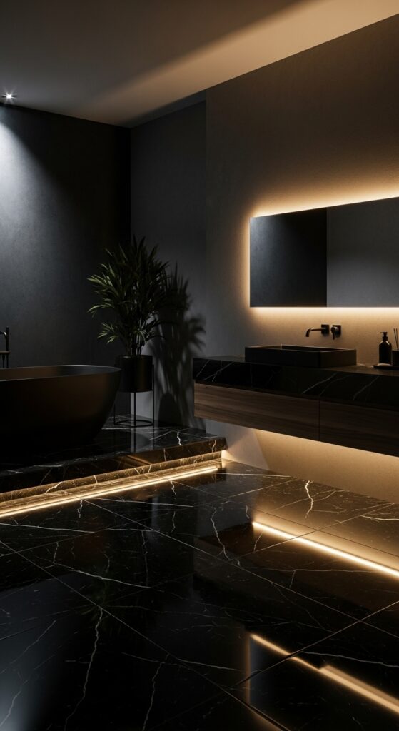 Flooring often gets overlooked in small bathrooms, but it can completely transform the mood if done right. Gothic flooring doesn’t need to be complicated—black-and-white checkered tiles, dark stone patterns, charcoal tiles, or matte black vinyl can all create the perfect foundation. If you’re not able to change the flooring completely, a dark rug or textured floor mat can give the space the visual weight it needs. Patterns like baroque florals or geometric Victorian designs add a subtle historical touch that nods to classic gothic architecture. Even in a tiny space, the right flooring can anchor the entire aesthetic beautifully.